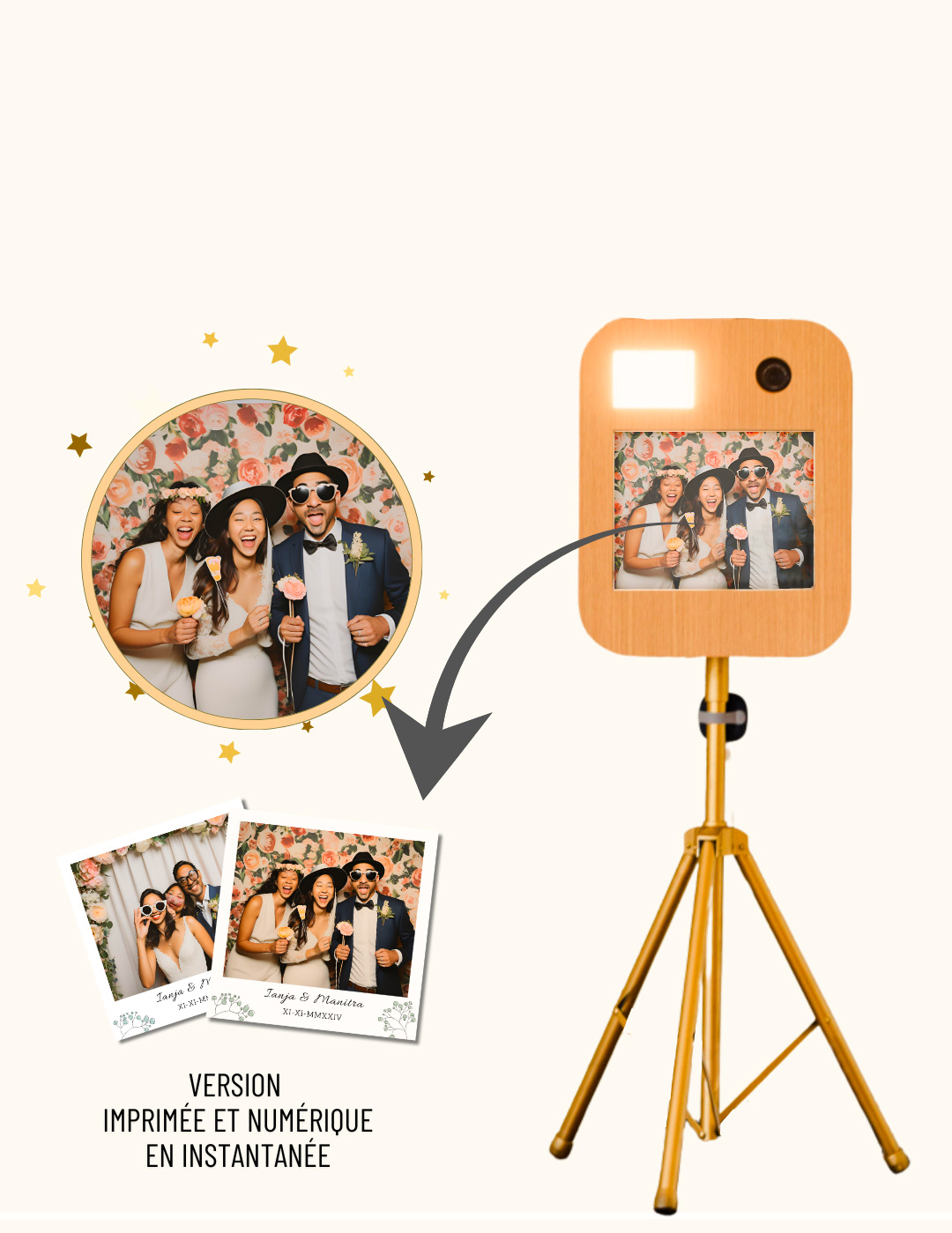 Cette borne photobooth intuitive est conçue pour garantir une utilisation simple et agréable, grâce à une interface interactive et automatisée qui permet de se prendre en photo et imprimer facilement.